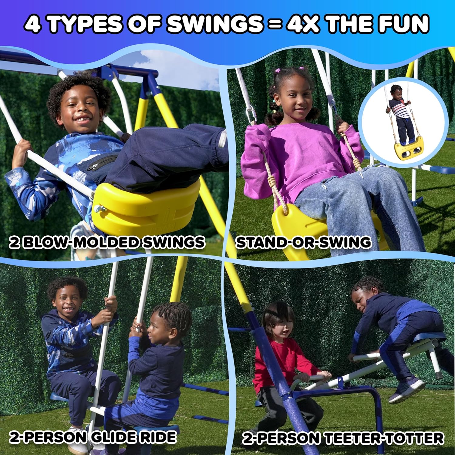- OUTDOOR FUN: The Sportspower Royal Fun Metal Swing set is feature packed with a 5ft wavy slide, 2-person Roman glider swing, standing/sitting blow-molded swing, and 2 blow molded swings. Up to 8 kids (100 lbs. each) can play on this swing set.