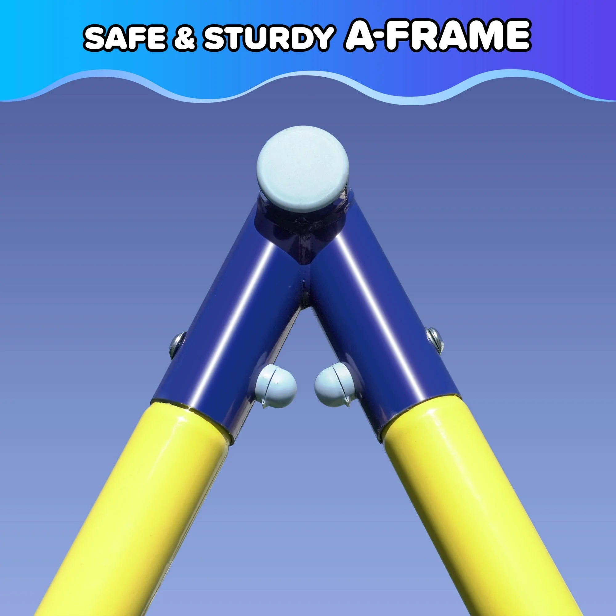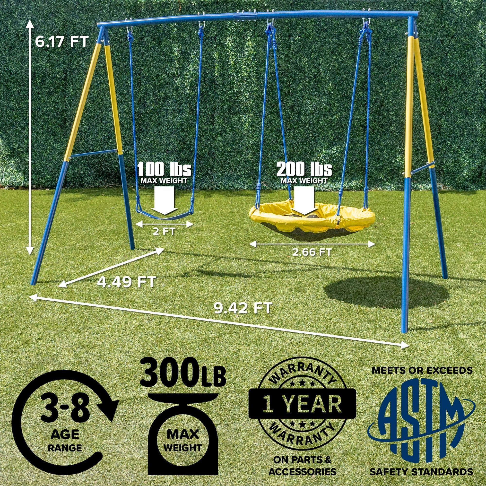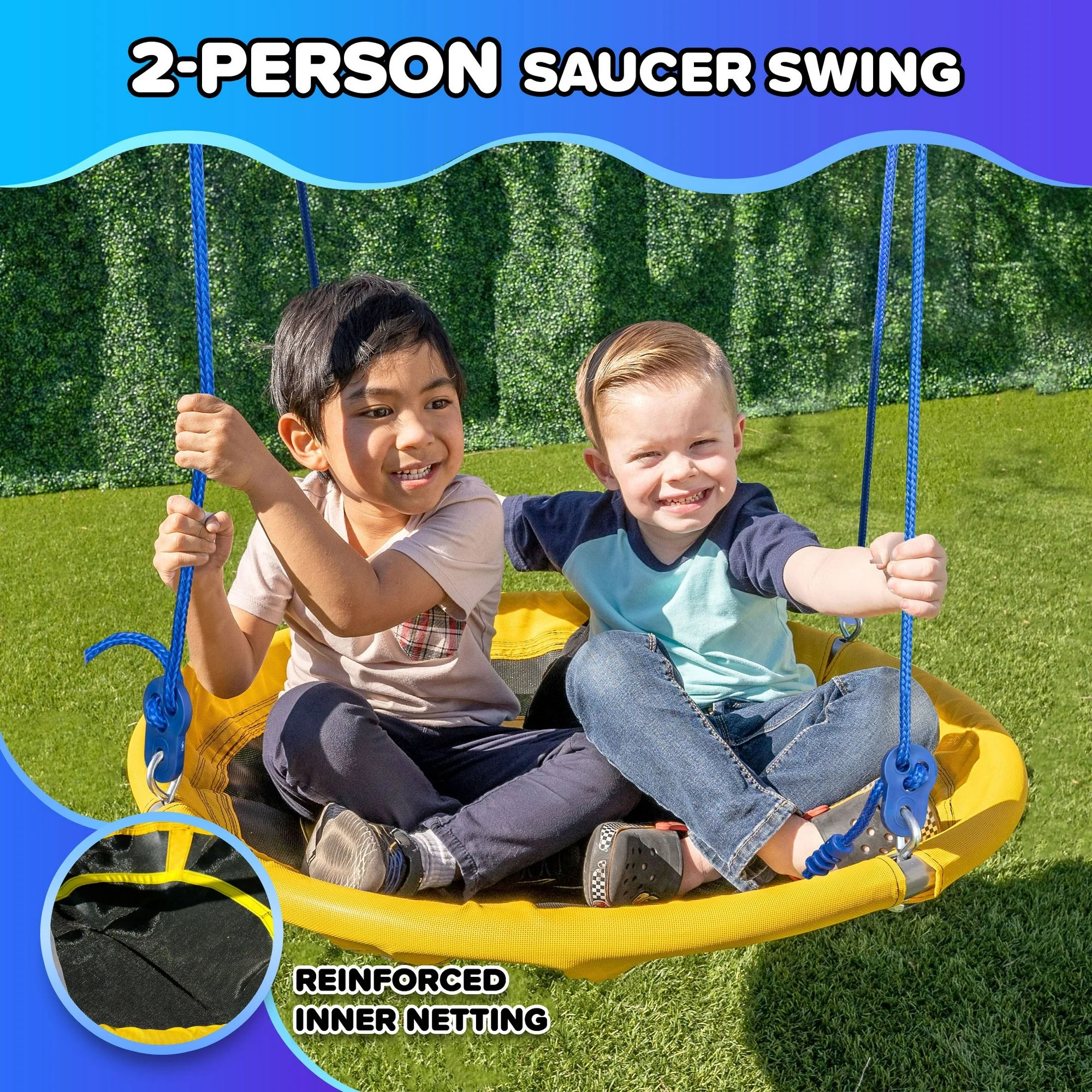 The Sportspower Swing and Saucer will become the highlight of your children's day. This swing set includes 1 belt swing and a saucer swing for endless swinging fun. The 2-person saucer swing is padded and has reinforced inner webbing for added comfort. The saucer swing fits 1-2 children. The metal frame is powder coated to help prevent corrosion and extend the longevity of your swing set. Give your kids continuous swinging fun with the Sportspower Swing and Saucer swing set. All Sportspower products meet or exceed all ASTM safety standards, so kids and parents can both enjoy this swing set with peace of mind.